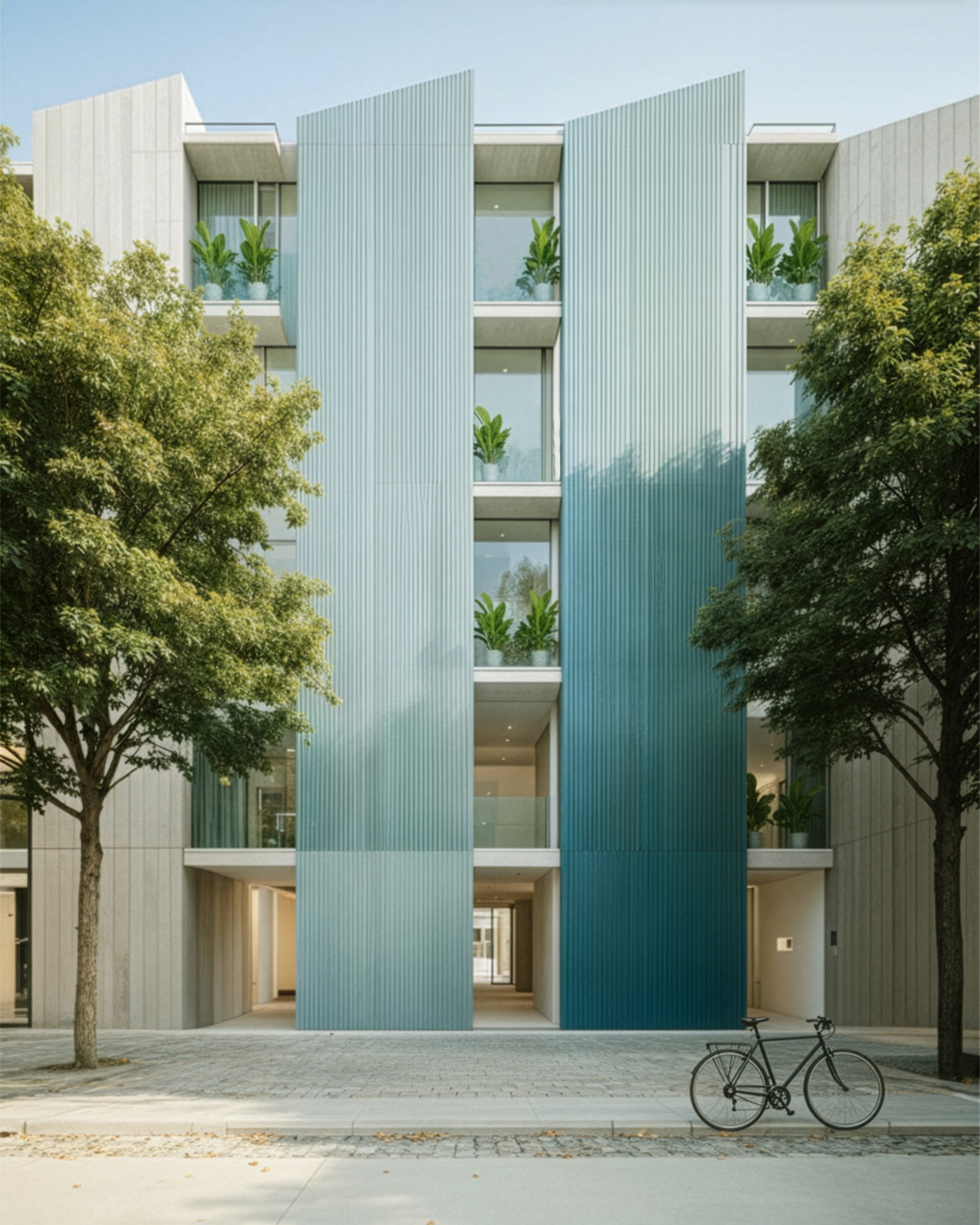A rhythmic contemporary dialogue between textured concrete and light-filtering metal, defining a new standard for design-forward multi-family living.